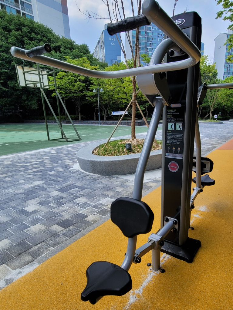 요즘, 아파트 공원에는 건강을 위한 다양한 운동 기구가 설치되어 있다.