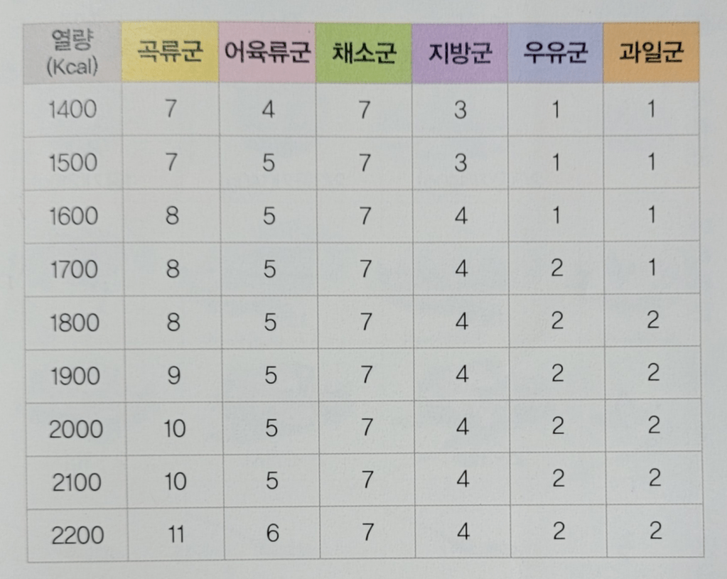 6가지 식품군 … 곡류군, 어육류군, 채소군, 지방군, 우유군, 과일군