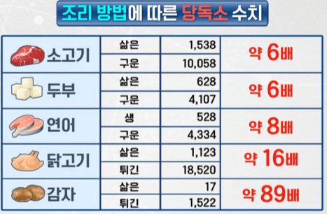 - 100도 이상 고온 조리 : 오븐 굽기 200~240도, 볶기 200~220도, 기름 튀기기 170~200도, 굽기 170도 이상