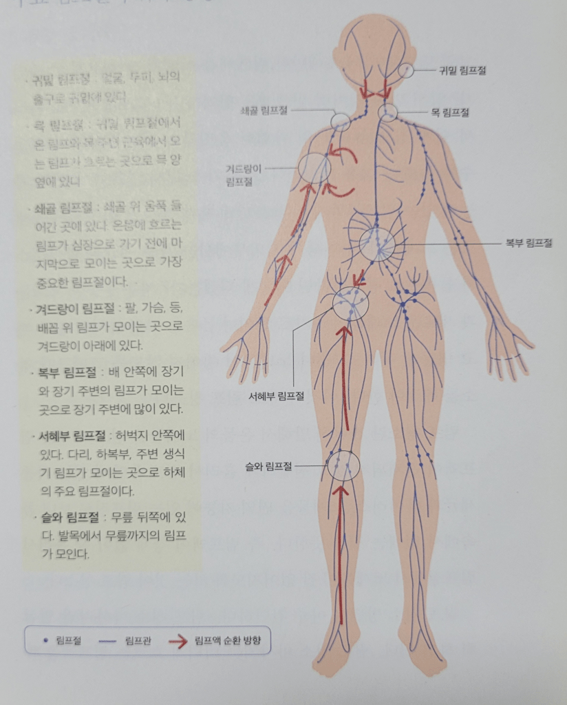 림프절에서 림프액을 깨끗하게 청소해준다. 우리 몸에는 약 500여개 림프절이 있는데. 그 중 300여개가 귀밑 림프절, 쇄골 림프절, 겨드랑이 림프절에 있다.