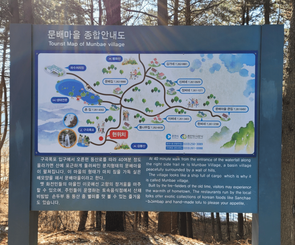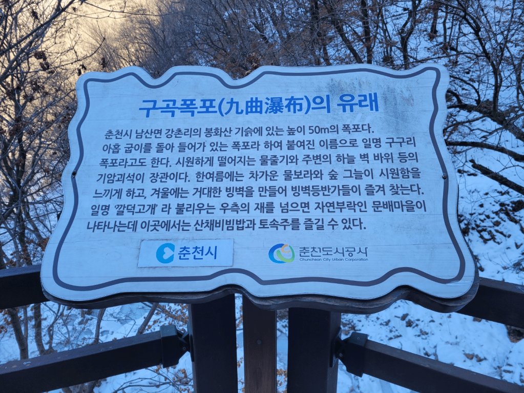 九曲瀑布 구곡폭포에 가다보면, 재미있는 스토리가 있는 나무 폿말이 있다.