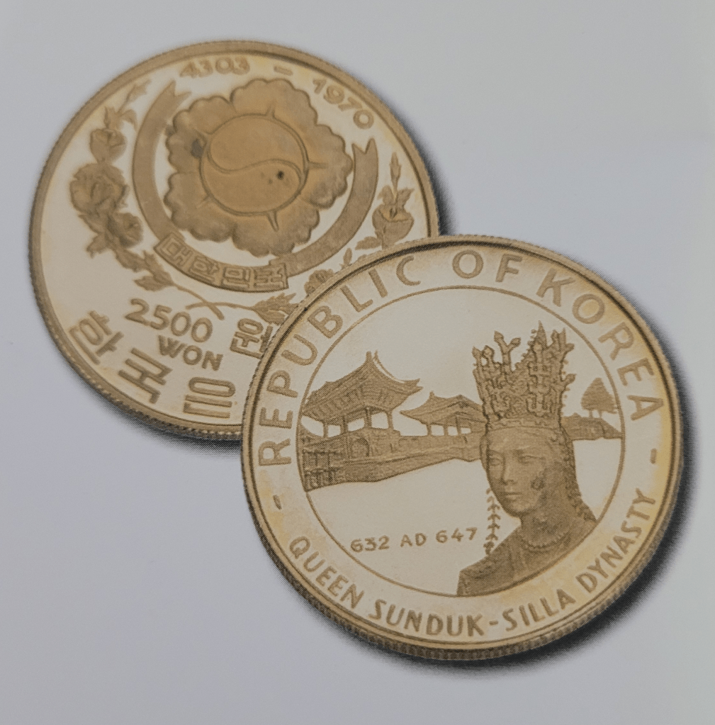 1971년 액면 2,500원 금화에는 우리나라 최초의 여왕으로 신라 27대왕 선덕여왕이 있다. 16년 동안 나라를 다스렸는데 성품이 너그럽고 어질며 지혜로운 왕으로 기록되어 있다.