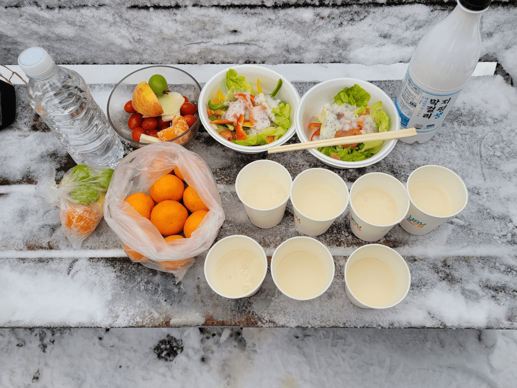 친구가 준비한 연어회 샐러드, 겨울 산 정상에서 먹는 맛이 일품이다.