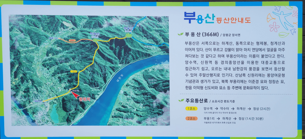 등산은 양수역에서 시작해서, 하계산, 부용산 정상까지 4.42 km 다. 소요 시간은 약 2시간 정도 걸렸다.