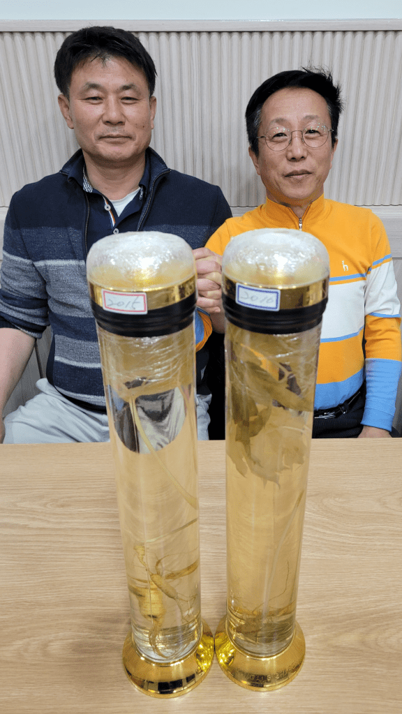 후배의 고향 심마니 친구가 직접 캔 산삼으로 2015년, 2016년에 담근 산삼주 다.