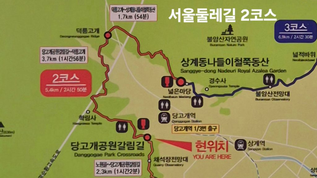 서울둘레길 2코스는 당고개공원갈림길에서 상계동나들이철쭉동산 까지, 5.4km 코스 (2시간 50분) 다.