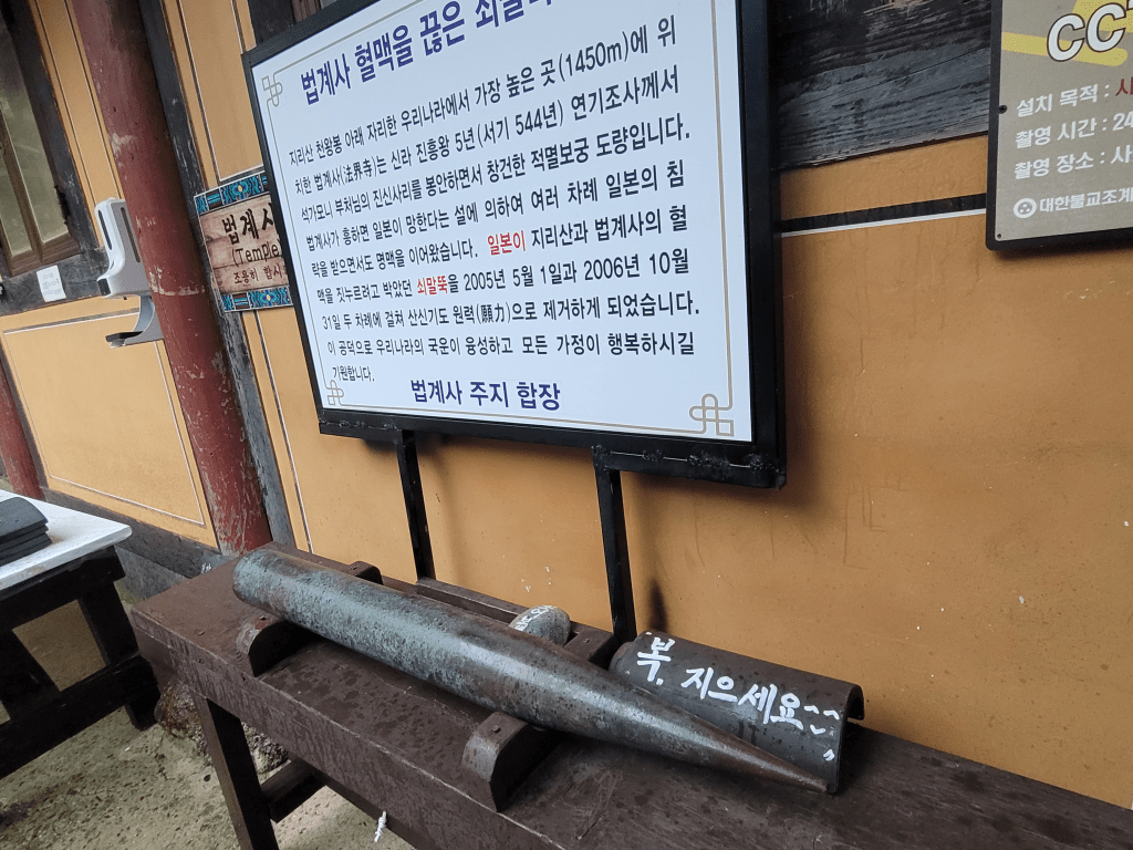 일본이 지리산과 법계사의 혈맥을 짓누르려고 박았던 쇠말뚝을 2005년 5월 1일과 2006년 10월 3일 두 차례에 걸쳐 산신 기도 원력으로 제거 했다. 『이 공덕으로 우리나라 국운이 융성하고 모든 가정에 행복하길 기원한다』는 법계사 주지의 안내문을 보면서 국력의 중요성을 다시 한번 느껴본다. (아래 사진)