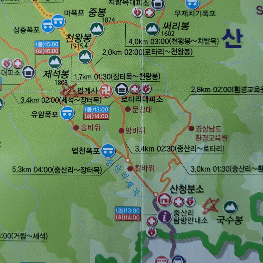 중산리탐방안내소 (버스 7분) →  경상남도환경교육원 (도보 1시간30분) → 법계사 (아래)